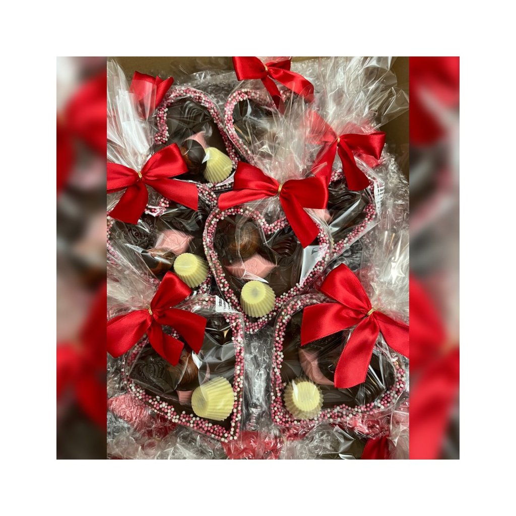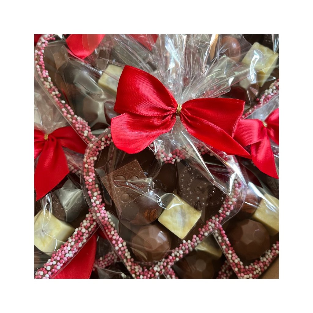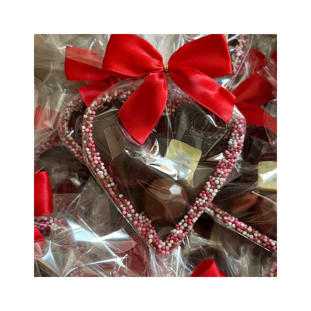 Formované duté srdce z mliečnej čokolády, zdobené cukrovými guličkami a plnené čokoládovými pralinkami MIX (náplň - ovocná, nugát, likér). Srdce je balené v celofáne s ozdobnou mašličkou.